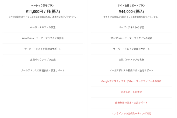 日々のメンテナンスを行える「ベーシックプラン」と、より売上や成約へとつなげる「サイト改善サポートプラン」の2種類がございます。